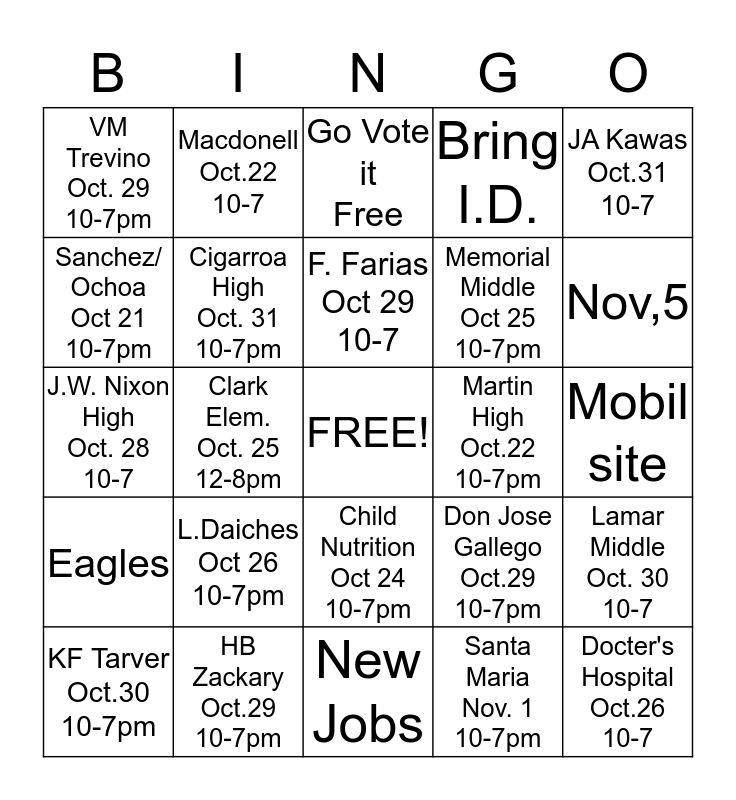 This bingo card has a free space and 24 words: L.Daiches Oct 26 10-7pm, HB Zackary Oct.29 10-7pm, F. Farias Oct 29 10-7, KF Tarver Oct.30 10-7pm, JA Kawas Oct.31 10-7, VM Trevino Oct. 29 10-7pm, Sanchez/ Ochoa Oct 21 10-7pm, Macdonell Oct.22 10-7, Martin High Oct.22 10-7pm, Child Nutrition Oct 24 10-7pm, Memorial Middle Oct 25 10-7pm, J.W. Nixon High Oct. 28 10-7, Don Jose Gallego Oct.29 10-7pm, Lamar Middle Oct. 30 10-7, Cigarroa High Oct. 31 10-7pm, Santa Maria Nov. 1 10-7pm, Mobil site, Go Vote it Free, Nov,5, Clark Elem. Oct. 25 12-8pm, Docter's Hospital Oct.26 10-7, Eagles, Bring I.D. and New Jobs.