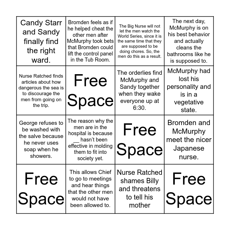 This bingo card has 16 words: Free Space, This allows Chief to go to meetings and hear things that the other men would not have been allowed to., The Big Nurse will not let the men watch the World Series, since it is the same time that they are supposed to be doing chores. So, the men do this as a result., The next day, McMurphy is on his best behavior and actually cleans the bathrooms like he is supposed to., Nurse Ratched finds articles about how dangerous the sea is to discourage the men from going on the trip., Bromden feels as if he helped cheat the other men after McMurphy took bets that Bromden could lift the control panel in the Tub Room., Free Space, Bromden and McMurphy meet the nicer Japanese nurse., Candy Starr and Sandy finally find the right ward., Free Space, Nurse Ratched shames Billy and threatens to tell his mother, McMurphy had lost his personality and is in a vegetative state., George refuses to be washed with the salve because he never uses soap when he showers., The reason why the men are in the hospital is because __ hasn’t been effective in molding them to fit into society yet., The orderlies find McMurphy and Sandy together when they wake everyone up at 6:30. and Free Space.
