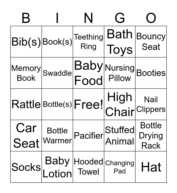 This bingo card has a free space and 57 words: Baby Gate, Socks, Photo Frame, Bib(s), Hooded Towel, Baby Monitor, Swaddle, Baby Shampoo, Nursing Pillow, Gift Card, Bath Toys, Nasal Aspirator, Crib Sheets, Teething Mitten, Baby Swing, Diaper Rash Cream, Bouncy Seat, Bottle(s), Onsie(s), Hat, High Chair, Car Seat Cover, Stuffed Animal, Teething Ring, Bath Thermometer, Baby Food, Bath Mat, Blanket, Booties, Pee Pee Teepee, Wash Cloths, Rubber Ducky, Diaper Bag, Burp Cloth, Nail Clippers, Memory Book, Bottle Warmer, Rattle, Play Mat/Gym, Car Seat, Book(s), Pacifier, Infant Carrier, Mobile, Blocks, Playard, Bottle Warmer, Baby Lotion, Baby Spoon(s), Baby Body Wash, Stroller, Changing Pad, Cloth Diapers, Diaper Cover(s), Bottle Brush, Bottle Drying Rack and Bath Tub.
