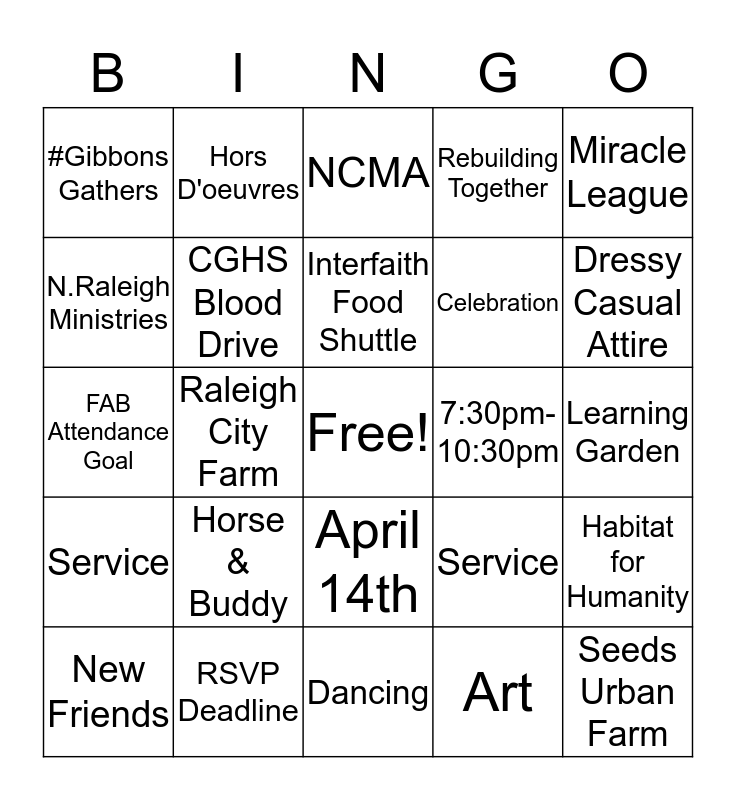 This bingo card has a free space and 37 words: Brown Bag Ministry, Raleigh Parks & Rec, Coral Riding Academy, CGHS Blood Drive, Habitat for Humanity, Horse & Buddy, Interfaith Food Shuttle, Marbles Kids Museum, Miracle League, Note in the Pocket, Raleigh City Farm, Rebuilding Together, Seeds Urban Farm, Learning Garden, N.Raleigh Ministries, Service, Daddy's Alright, NCMA, April 14th, 7:30pm-10:30pm, #Gibbons Gathers, Dressy Casual Attire, New Friends, Dancing, Spring Social, Art, Hors D'oeuvres, Cocktails, Photo Booth, JOY, "Pregame" Party, RSVP Deadline, FAB Attendance Goal, Educator Sponsor, Service, Celebration and CGHS Community.