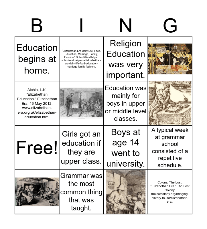 This bingo card has 6 images and 14 words: A typical week at grammar school consisted of a repetitive schedule., Only had 24 letters in their alphabet., Religion Education was very important., At ages 10-14 they learned arithmetic and a bit of Greek., Alchin, L.K. “Elizabethan Education.” Elizabethan Era, 16 May 2012, www.elizabethan-era.org.uk/elizabethan-education.htm., Grammar was the most common thing that was taught., Education begins at home., Free!, “Elizabethan Era Daily Life: Food, Education, Marriage, Family, Fashion.” SchoolWorkHelper, schoolworkhelper.net/elizabethan-era-daily-life-food-education-marriage-family-fashion/., Girls got an education if they are upper class., Boys at age 14 went to university., Colony, The Lost. “Elizabethan Era.” The Lost Colony, thelostcolony.org/bringing-history-to-life/elizabethan-era/., Education was mainly for boys in upper or middle level classes. and Teachings from various faculties were available to University students..
