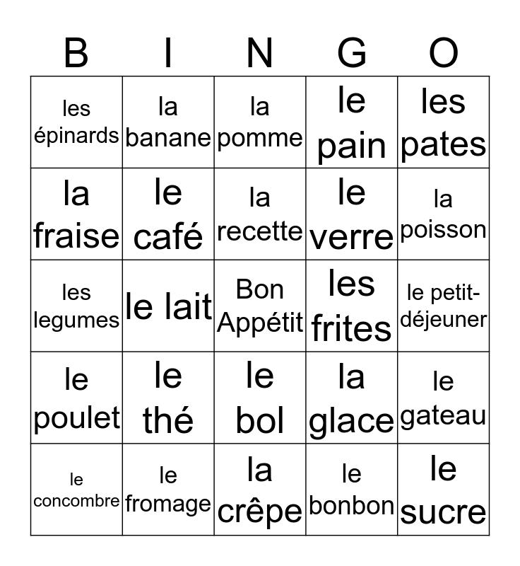 This bingo card has a free space and 25 words: le thé, la crêpe, la recette, le concombre, les pates, les épinards, la fraise, la banane, les frites, le bol, le verre, les legumes, la glace, le gateau, le café, la confiture, le petit-déjeuner, la pomme, la poisson, le lait, le sucre, le fromage, le poulet, le pain and le bonbon.