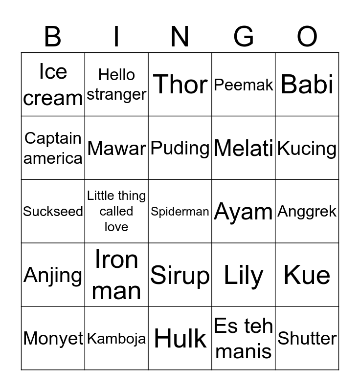This bingo card has a free space and 24 words: Iron man, Kamboja, Puding, Monyet, Babi, Ice cream, Captain america, Hello stranger, Ayam, Sirup, Melati, Suckseed, Lily, Kue, Mawar, Es teh manis, Anggrek, Thor, Kucing, Little thing called love, Shutter, Anjing, Peemak and Hulk.