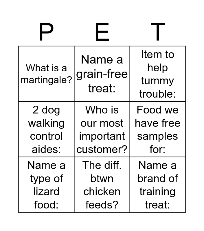 This bingo card has 9 words: Name a type of lizard food:, Item to help tummy trouble:, Name a grain-free treat:, 2 dog walking control aides:, What is a martingale?, Food we have free samples for:, Who is our most important customer?, Name a brand of training treat: and The diff. btwn chicken feeds?.