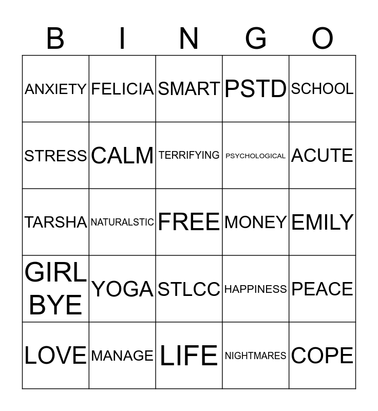 This bingo card has a free space and 24 words: YOGA, MANAGE, TERRIFYING, LOVE, SCHOOL, ANXIETY, STRESS, FELICIA, MONEY, STLCC, PSYCHOLOGICAL, TARSHA, HAPPINESS, PEACE, CALM, NIGHTMARES, EMILY, SMART, ACUTE, NATURALSTIC, COPE, GIRL BYE, PSTD and LIFE.