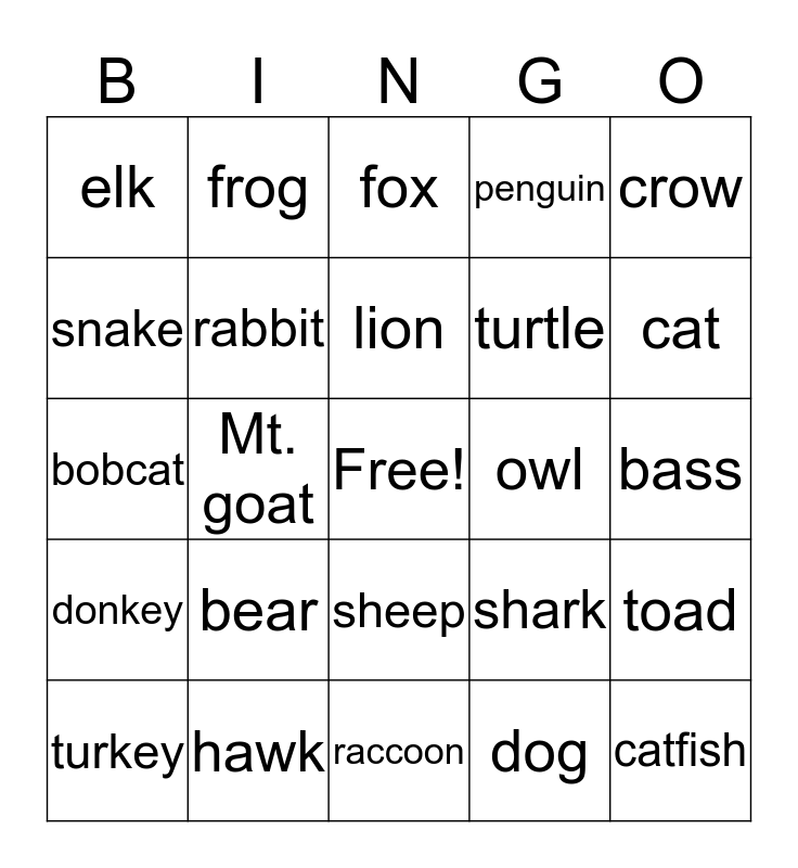 This bingo card has a free space and 29 words: turkey, deer, Mt. goat, moose, elk, fox, rabbit, bear, owl, hawk, bass, catfish, raccoon, dog, cat, hamster, sheep, donkey, crow, bobcat, shark, whale, turtle, snake, penguin, frog, toad, lion and tiger.