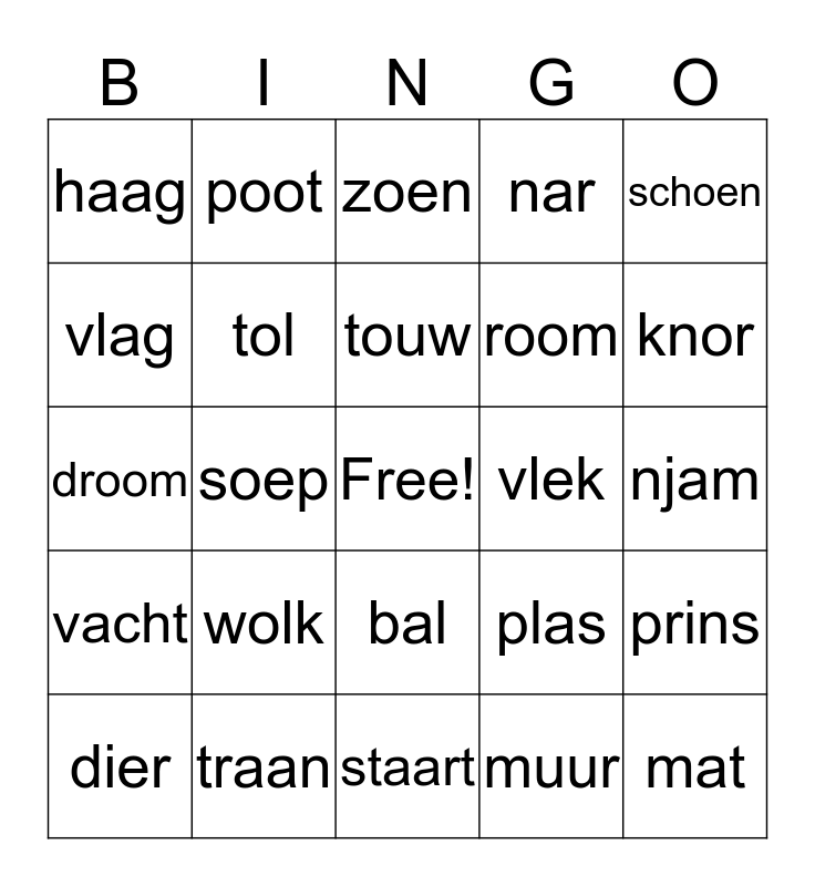 This bingo card has a free space and 28 words: prins, taart, room, muur, vlag, zoen, poot, vacht, vlek, dier, droom, nar, traan, staart, knor, kroon, wolk, tol, touw, bal, haag, prei, mat, soep, njam, plas, schoen and school.