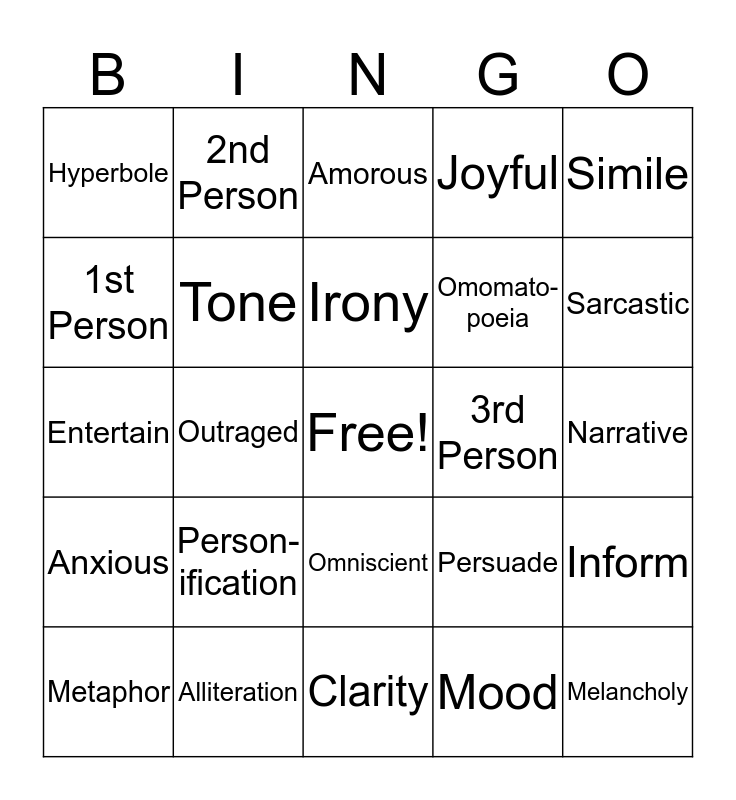 This bingo card has a free space and 24 words: Person-ification, Alliteration, Irony, Metaphor, Simile, Hyperbole, 1st Person, 2nd Person, 3rd Person, Omniscient, Omomato-poeia, Entertain, Persuade, Inform, Tone, Mood, Narrative, Amorous, Sarcastic, Outraged, Melancholy, Anxious, Joyful and Clarity.