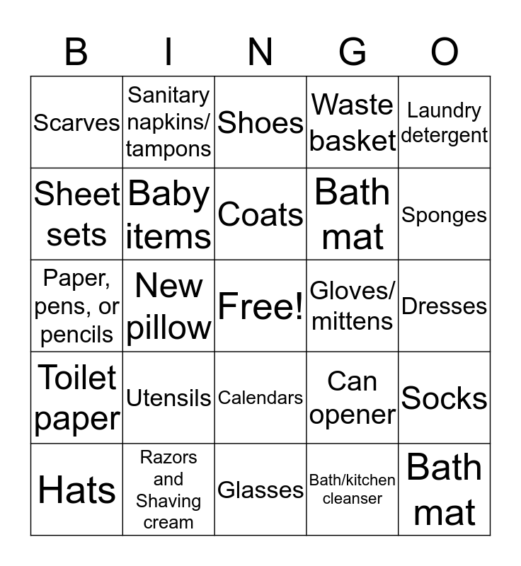 This bingo card has a free space and 24 words: Utensils, Razors and Shaving cream, Coats, Hats, Laundry detergent, Scarves, Sheet sets, Sanitary napkins/ tampons, Gloves/ mittens, Calendars, Bath mat, Paper, pens, or pencils, Can opener, Socks, Baby items, Bath/kitchen cleanser, Dresses, Shoes, Sponges, New pillow, Bath mat, Toilet paper, Waste basket and Glasses.