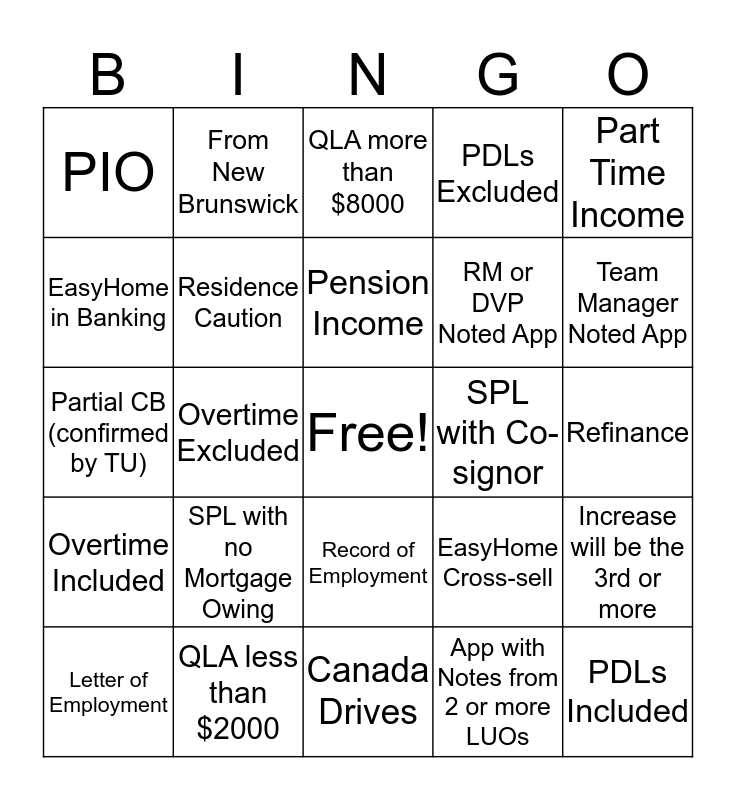 This bingo card has a free space and 39 words: Income Caution, Identity Caution, Banking Caution, Residence Caution, Letter of Employment, Record of Employment, Pension Income, Disability Income, Part Time Income, Overtime Included, Overtime Excluded, PDLs Excluded, PDLs Included, Refinance, SPL with Co-signor, SPL with no Mortgage Owing, SIO, PIO, SIT, EasyHome Cross-sell, EasyHome in Banking, Canada Drives, RM or DVP Noted App, Team Manager Noted App, From BC, From Alberta, From Saskatchewan, From Manitoba, From Ontario, From New Brunswick, From Nova Scotia, From New Foundland, QLA more than $8000, QLA less than $2000, App with Notes from 2 or more LUOs, Employment Verification on GV#, Increase will be the 3rd or more, Partial CB (confirmed by TU) and Same Initial for Cx First and Last Name.