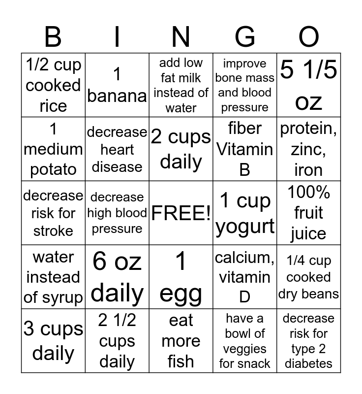 This bingo card has a free space and 24 words: 6 oz daily, 2 1/2 cups daily, 2 cups daily, 3 cups daily, 5 1/5 oz, 1/2 cup cooked rice, 1 medium potato, 1 banana, 1 cup yogurt, 1 egg, fiber Vitamin B, decrease risk for stroke, calcium, vitamin D, 1/4 cup cooked dry beans, decrease heart disease, have a bowl of veggies for snack, 100% fruit juice, add low fat milk instead of water, protein, zinc, iron, decrease high blood pressure, decrease risk for type 2 diabetes, water instead of syrup, improve bone mass and blood pressure and eat more fish.