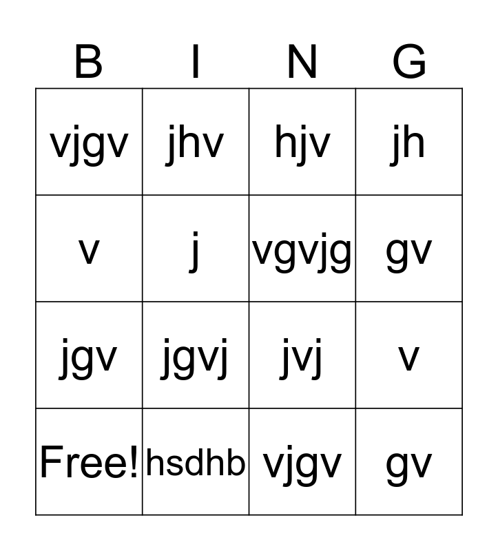 This bingo card has 16 words: Free!, hsdhb, hjv, jh, v, jhv, jvj, v, vjgv, j, vjgv, gv, jgv, jgvj, vgvjg and gv.