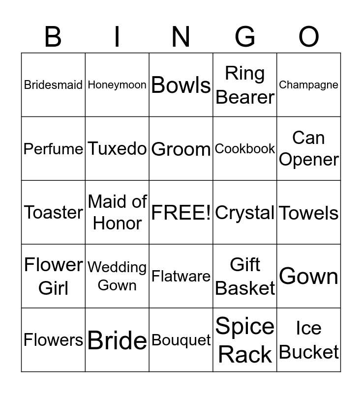 This bingo card has a free space and 24 words: Wedding Gown, Bride, Groom, Flowers, Champagne, Bridesmaid, Perfume, Honeymoon, Crystal, Flatware, Cookbook, Toaster, Gift Basket, Gown, Tuxedo, Spice Rack, Towels, Bowls, Can Opener, Maid of Honor, Ice Bucket, Flower Girl, Ring Bearer and Bouquet.