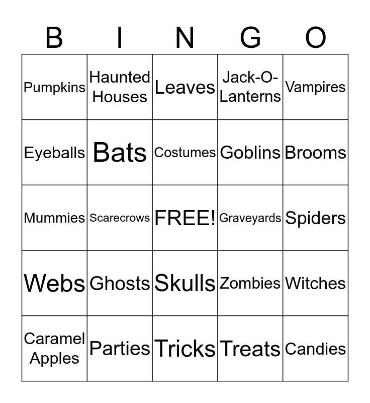 This bingo card has a free space and 24 words: Ghosts, Parties, Costumes, Caramel Apples, Vampires, Pumpkins, Eyeballs, Haunted Houses, Graveyards, Skulls, Goblins, Mummies, Zombies, Witches, Bats, Treats, Spiders, Leaves, Brooms, Scarecrows, Candies, Webs, Jack-O-Lanterns and Tricks.