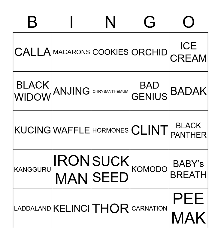 This bingo card has a free space and 24 words: IRON MAN, KELINCI, CHRYSANTHEMUM, LADDALAND, ICE CREAM, CALLA, BLACK WIDOW, MACARONS, CLINT, SUCK SEED, BAD GENIUS, KUCING, KOMODO, BABY’s BREATH, ANJING, CARNATION, BLACK PANTHER, COOKIES, BADAK, WAFFLE, PEE MAK, KANGGURU, ORCHID and THOR.