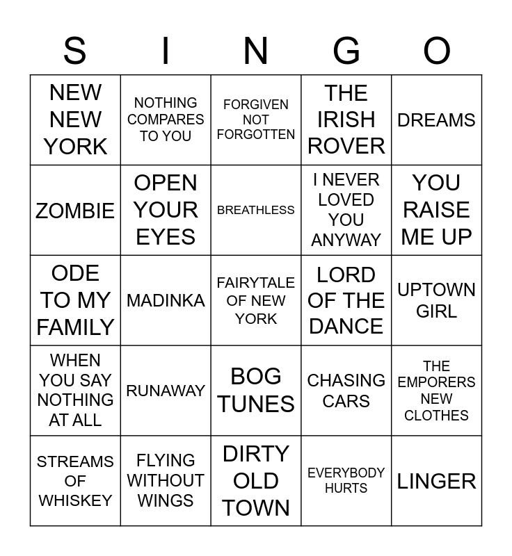 This bingo card has 25 words: RUNAWAY, DIRTY OLD TOWN, BREATHLESS, STREAMS OF WHISKEY, DREAMS, NEW NEW YORK, ZOMBIE, NOTHING COMPARES TO YOU, LORD OF THE DANCE, BOG TUNES, I NEVER LOVED YOU ANYWAY, ODE TO MY FAMILY, CHASING CARS, THE EMPORERS NEW CLOTHES, OPEN YOUR EYES, LINGER, UPTOWN GIRL, FORGIVEN NOT FORGOTTEN, YOU RAISE ME UP, MADINKA, FAIRYTALE OF NEW YORK, FLYING WITHOUT WINGS, WHEN YOU SAY NOTHING AT ALL, THE IRISH ROVER and EVERYBODY HURTS.