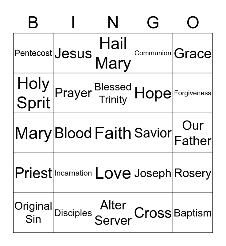 This bingo card has a free space and 24 words: Incarnation, Disciples, Blessed Trinity, Original Sin, Grace, Pentecost, Holy Sprit, Jesus, Savior, Love, Hope, Mary, Joseph, Rosery, Prayer, Cross, Our Father, Hail Mary, Forgiveness, Blood, Baptism, Priest, Communion and Alter Server.
