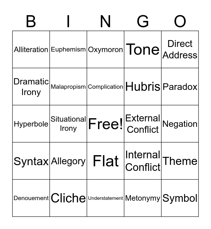 This bingo card has a free space and 24 words: Allegory, Cliche, Complication, Denouement, Direct Address, Alliteration, Dramatic Irony, Euphemism, External Conflict, Flat, Hubris, Hyperbole, Internal Conflict, Theme, Malapropism, Metonymy, Negation, Oxymoron, Paradox, Situational Irony, Symbol, Syntax, Tone and Understatement.