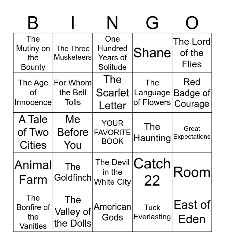This bingo card has a free space and 24 words: The Goldfinch, The Valley of the Dolls, The Scarlet Letter, The Bonfire of the Vanities, The Lord of the Flies, The Mutiny on the Bounty, The Age of Innocence, The Three Musketeers, The Haunting, The Devil in the White City, The Language of Flowers, A Tale of Two Cities, Catch 22, Room, For Whom the Bell Tolls, Tuck Everlasting, Great Expectations, One Hundred Years of Solitude, Red Badge of Courage, Me Before You, East of Eden, Animal Farm, Shane and American Gods.