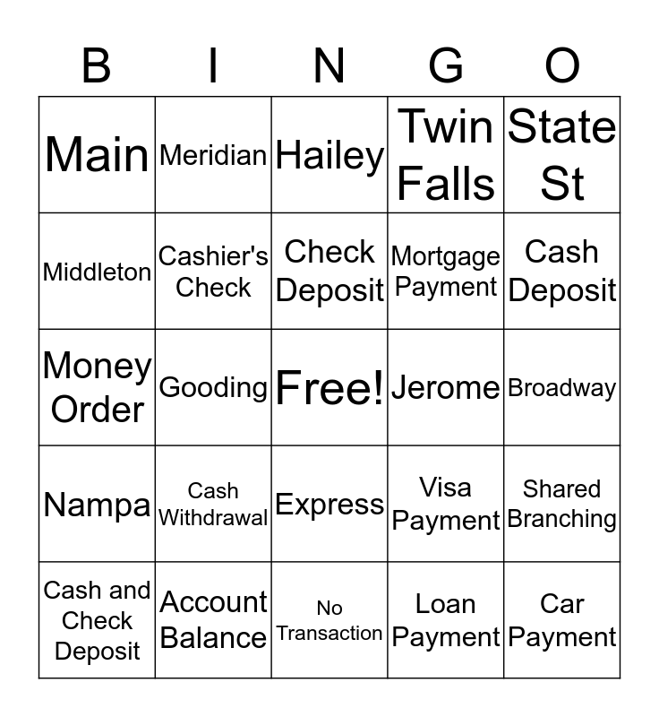 This bingo card has a free space and 24 words: Cash and Check Deposit, Cash Withdrawal, Check Deposit, Loan Payment, State St, Main, Meridian, Hailey, Jerome, Broadway, Money Order, Cashier's Check, Visa Payment, Shared Branching, Middleton, Account Balance, No Transaction, Twin Falls, Cash Deposit, Nampa, Gooding, Express, Mortgage Payment and Car Payment.