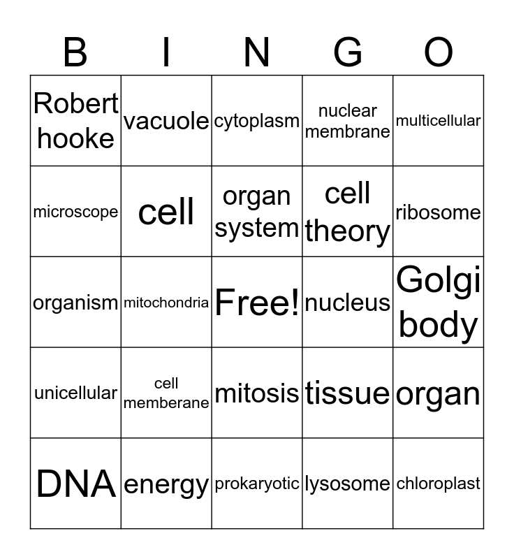This bingo card has a free space and 24 words: cell memberane, energy, organ system, DNA, multicellular, Robert hooke, microscope, vacuole, nucleus, mitosis, cell theory, organism, tissue, organ, cell, lysosome, Golgi body, cytoplasm, ribosome, mitochondria, chloroplast, unicellular, nuclear membrane and prokaryotic.