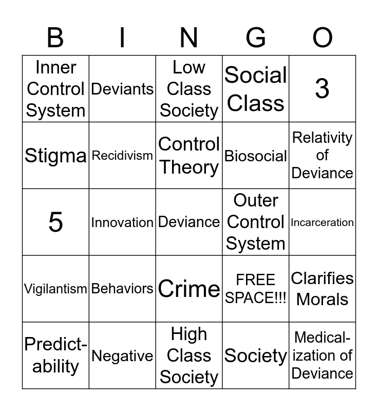 This bingo card has 25 words: Behaviors, High Class Society, Control Theory, Predict-ability, 3, Inner Control System, Stigma, Deviants, Outer Control System, Crime, Biosocial, 5, FREE SPACE!!!, Clarifies Morals, Recidivism, Medical-ization of Deviance, Incarceration, Low Class Society, Relativity of Deviance, Innovation, Deviance, Negative, Vigilantism, Social Class and Society.