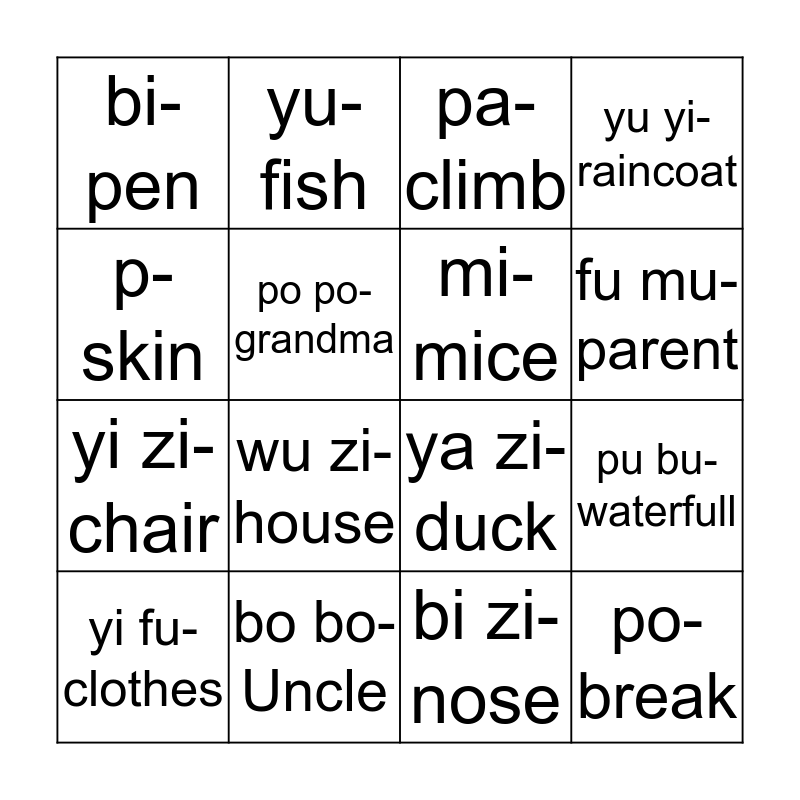 This bingo card has 16 words: bo bo-Uncle, pu bu-waterfull, pa-climb, bi-pen, yi zi-chair, yu-fish, ya zi-duck, bi zi-nose, p-skin, po po-grandma, yi fu-clothes, yu yi-raincoat, wu zi-house, fu mu-parent, mi-mice and po-break.