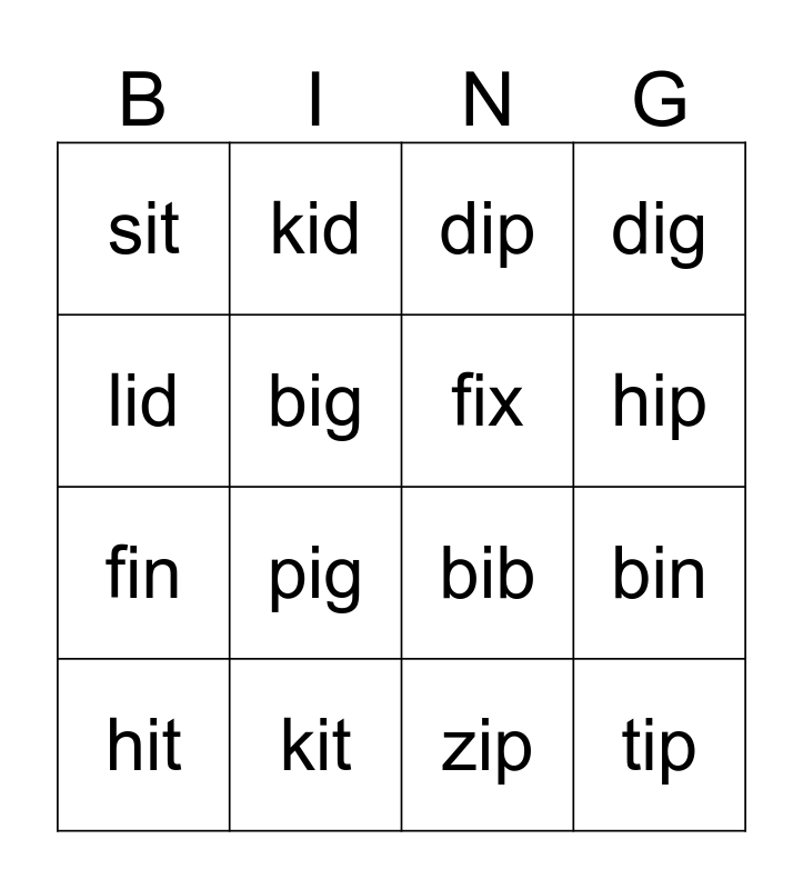 This bingo card has 16 words: kit, bin, dip, sit, fin, kid, bib, zip, lid, big, hit, dig, pig, hip, fix and tip.
