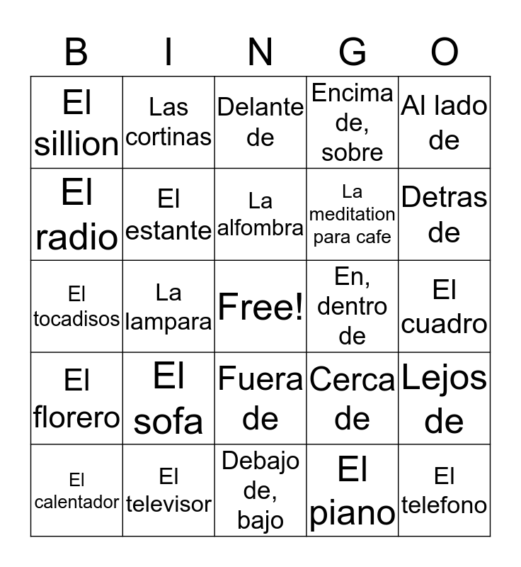 This bingo card has a free space and 24 words: El sofa, El televisor, La alfombra, El calentador, Al lado de, El sillion, El radio, Las cortinas, En, dentro de, Fuera de, La meditation para cafe, El tocadisos, Cerca de, Lejos de, El estante, El piano, El cuadro, Delante de, Detras de, La lampara, El telefono, El florero, Encima de, sobre and Debajo de, bajo.