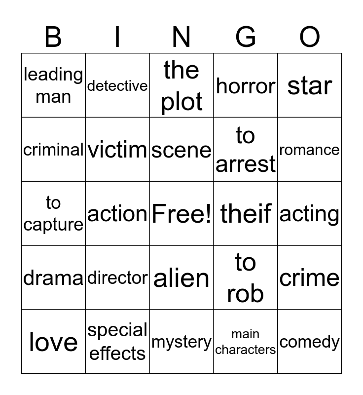 This bingo card has a free space and 24 words: director, special effects, scene, love, star, leading man, criminal, detective, theif, alien, to arrest, to capture, to rob, crime, victim, main characters, acting, the plot, romance, action, comedy, drama, horror and mystery.