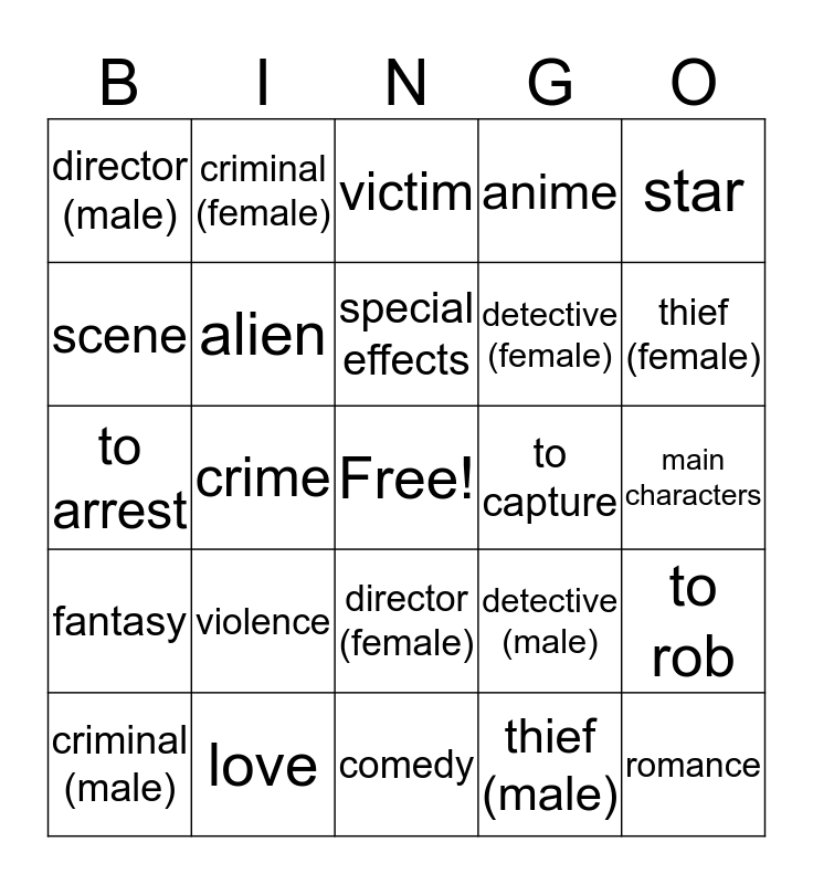 This bingo card has a free space and 24 words: violence, love, special effects, criminal (male), star, director (male), scene, criminal (female), to capture, director (female), detective (female), to arrest, detective (male), to rob, alien, thief (male), main characters, victim, thief (female), crime, romance, fantasy, anime and comedy.