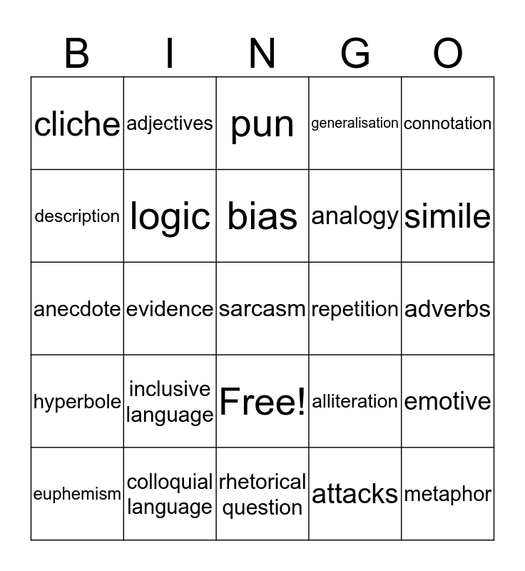 This bingo card has 26 words: Free!, attacks, bias, colloquial language, connotation, cliche, description, adjectives, adverbs, alliteration, analogy, anecdote, emotive, euphemism, evidence, expert opinion, generalisation, hyperbole, pun, sarcasm, simile, rhetorical question, repetition, inclusive language, logic and metaphor.