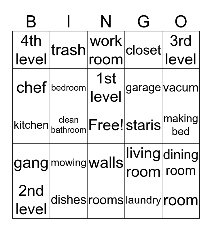 This bingo card has a free space and 24 words: mowing, dishes, 1st level, 2nd level, 3rd level, 4th level, chef, trash, staris, walls, garage, kitchen, living room, dining room, bedroom, laundry, making bed, work room, vacum, clean bathroom, room, gang, closet and rooms.