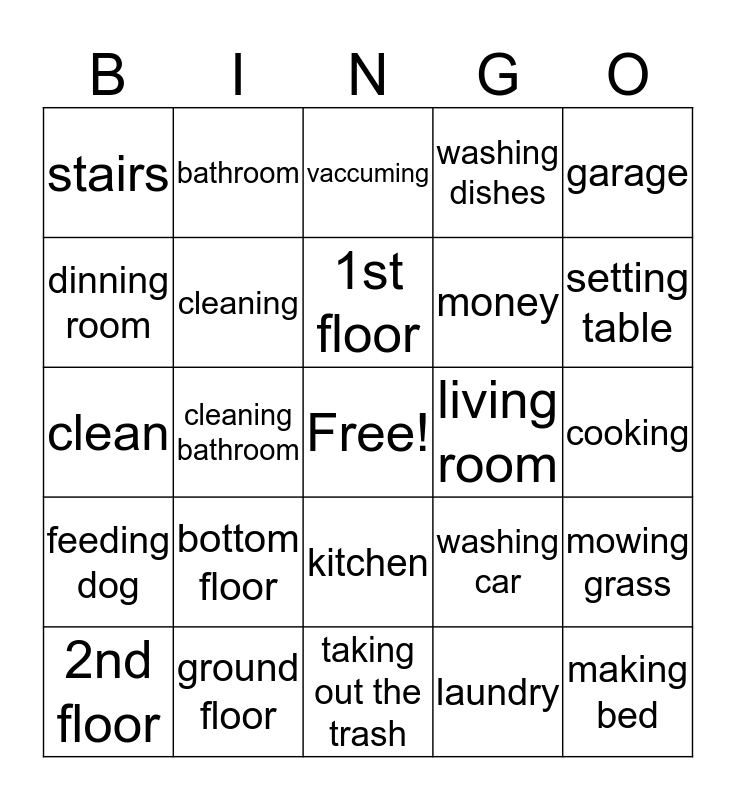 This bingo card has a free space and 24 words: bottom floor, ground floor, 1st floor, 2nd floor, garage, stairs, dinning room, bathroom, living room, kitchen, money, clean, washing car, mowing grass, cleaning, laundry, cooking, vaccuming, setting table, cleaning bathroom, making bed, feeding dog, washing dishes and taking out the trash.