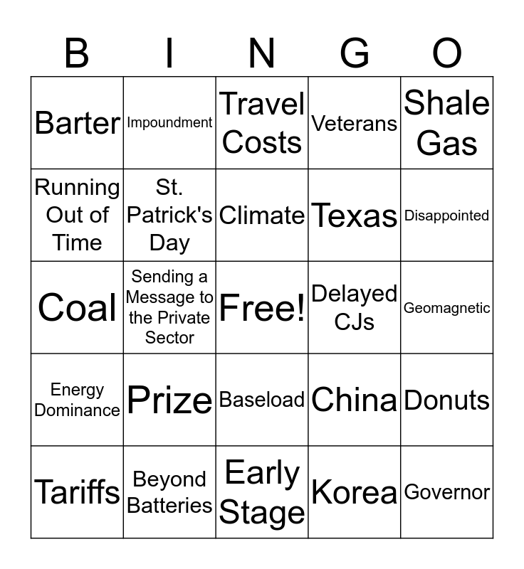 This bingo card has a free space and 24 words: Prize, Beyond Batteries, Climate, Tariffs, Shale Gas, Barter, Running Out of Time, Impoundment, Delayed CJs, Baseload, Texas, Coal, China, Donuts, St. Patrick's Day, Korea, Geomagnetic, Travel Costs, Disappointed, Sending a Message to the Private Sector, Governor, Energy Dominance, Veterans and Early Stage.
