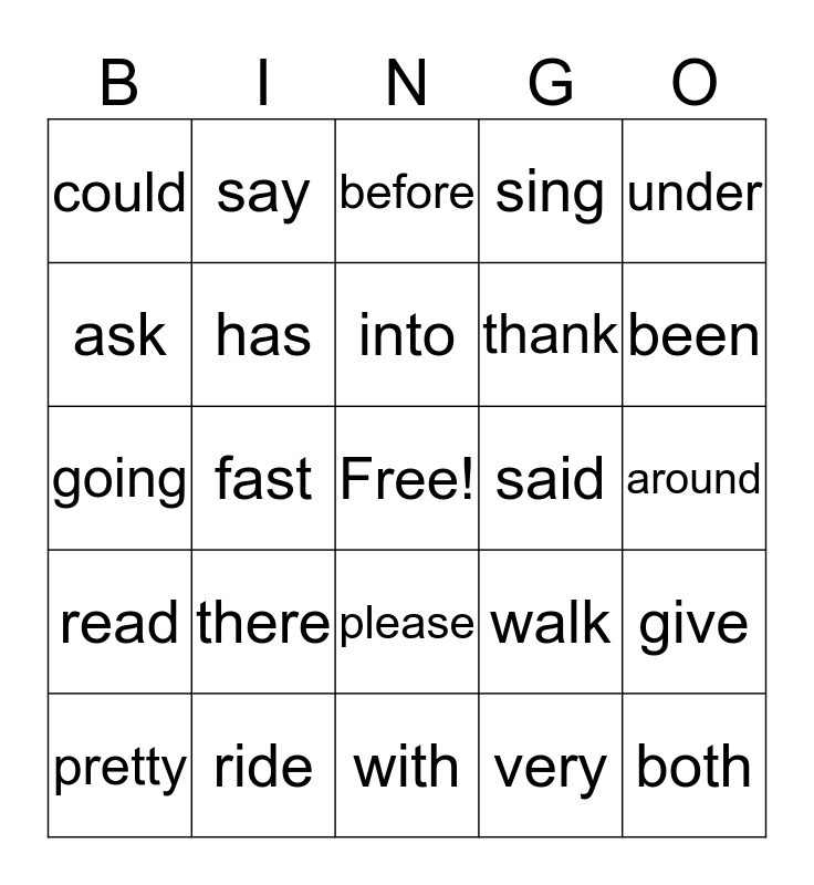 This bingo card has a free space and 24 words: there, ride, into, pretty, under, could, ask, say, said, please, thank, going, walk, give, has, very, around, before, been, fast, both, read, sing and with.