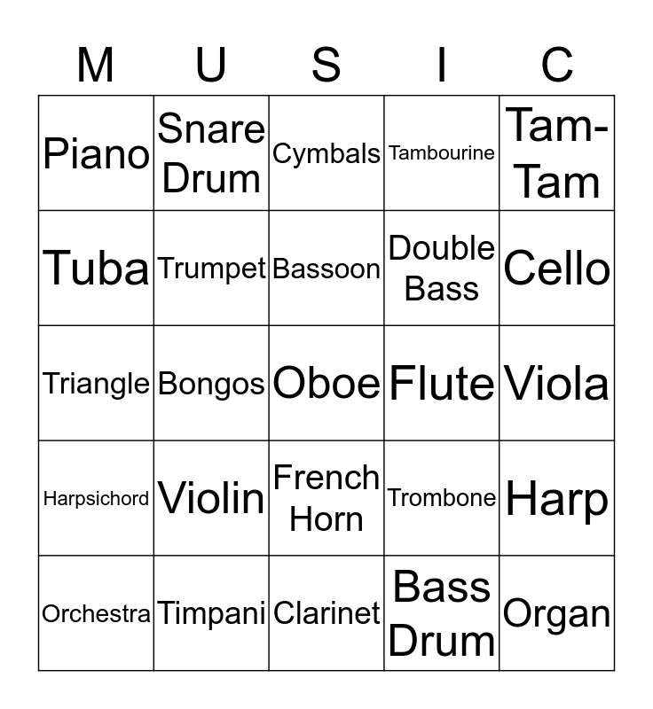 This bingo card has 25 words: Violin, Clarinet, Bassoon, Orchestra, Tam-Tam, Piano, Tuba, Snare Drum, Flute, French Horn, Double Bass, Triangle, Trombone, Harp, Trumpet, Organ, Viola, Cymbals, Cello, Bongos, Oboe, Timpani, Harpsichord, Tambourine and Bass Drum.