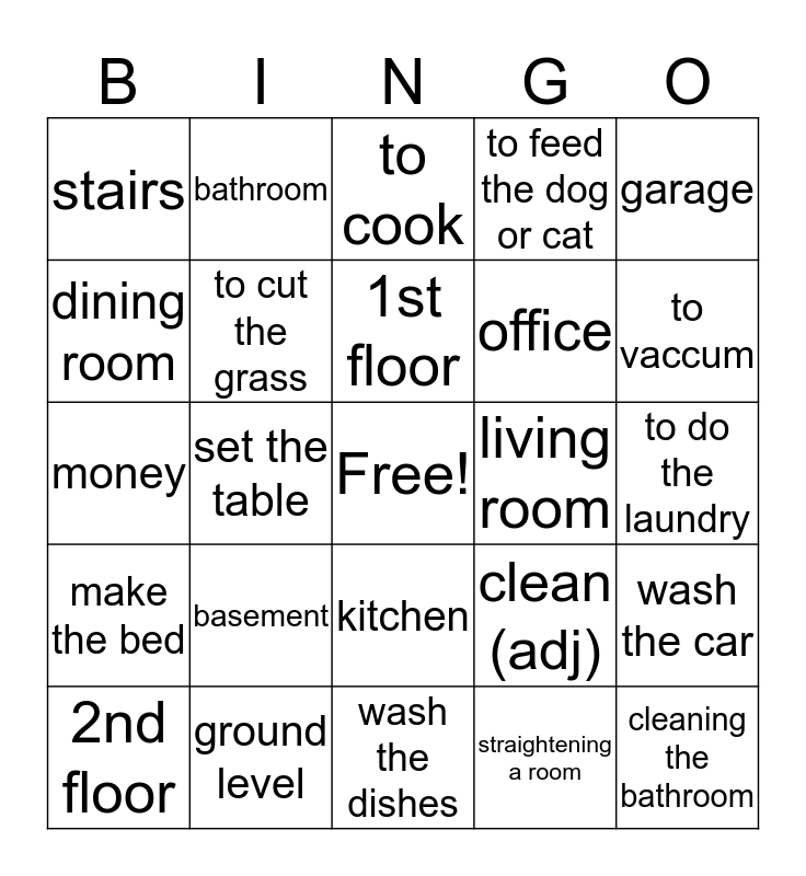 This bingo card has a free space and 24 words: basement, ground level, 1st floor, 2nd floor, garage, stairs, dining room, bathroom, living room, kitchen, office, money, clean (adj), wash the car, to cut the grass, straightening a room, to do the laundry, to cook, to vaccum, set the table, cleaning the bathroom, make the bed, to feed the dog or cat and wash the dishes.