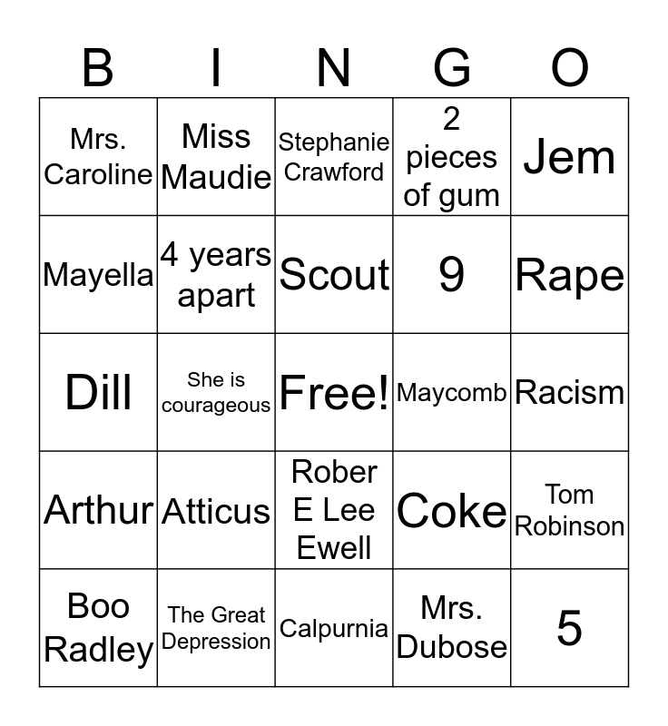 This bingo card has a free space and 24 words: Boo Radley, Atticus, Scout, Mrs. Dubose, Jem, Mrs. Caroline, Miss Maudie, Stephanie Crawford, Maycomb, Racism, Dill, 4 years apart, Coke, Tom Robinson, Mayella, The Great Depression, Calpurnia, 2 pieces of gum, Rape, Arthur, She is courageous, Rober E Lee Ewell, 9 and 5.