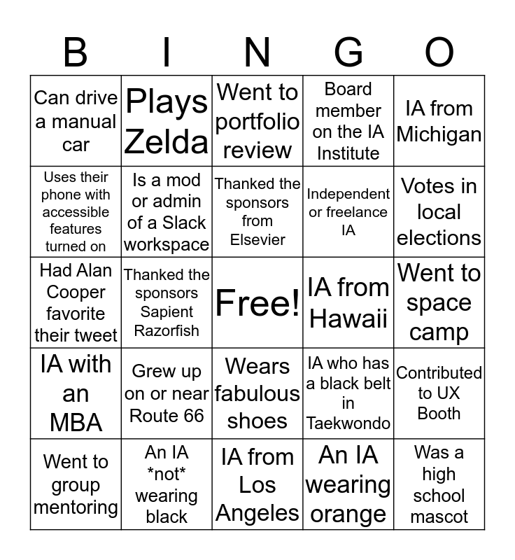 This bingo card has a free space and 120 words: Spoke to Handrail/Connectfive sponsor, IA who teaches, Is an IAS volunteer, Is an IAS Student Scholar, IA who plays a piano, Spoke at IAS18, Board member on the IA Institute, Someone from UXPRESSIA, Contributed to UX Booth, Person or company that is hiring, Uses OptimalWorkshop as part of their practice, Knows someone who works for the Mouse, An IA celebrating a birthday, An IA wearing pink, Went to yoga at 7am, Has an Android phone, Wears fabulous shoes, IA from Europe, IA from Asia, Would wear a rhinestone conference lanyard, Went to group mentoring, Went to portfolio review, IA from Australia, IA from Japan, IA from Africa, IA with an MBA, An IA *not* wearing black, Thanked the sponsors HS2 Solutions, Thanked Ameritrade for sponsoring, Spouses at the Summit, An IA wearing orange, Thanked the sponsors Sapient Razorfish, Thanked the sponsors from Elsevier, Someone's 5th or more IA Summit, Allergic to shrimp, Polar Bear Fun Run, An IA wearing green, Has spoken at IAS before, Presented a talk at World IA Day, Has been to any WIAD event, Is a twin, Took on a pro bono side project, First timer at IAS, IA from the Netherlands, Presented a poster at IAS18, Has WAVE extension installed on their browser, IA from Florida, IA from Hawaii, Navigates their website by keyboard, Speaks Japanese, Speaks German, IA from Boston, IA who has a black belt in Taekwondo, Speaks Spanish, IA from Brooklyn, Plays a musical instrument, Drives a Prius, Drives a Tesla, Was in their high school band, Plays Zelda, Watches kdrama, Organizes their clothes by frequency of wear, Went to Kent State University, Thanked the sponsors Axure, Had their headshot taken at the Career Center, Uses their phone with accessible features turned on, Thanked Capital One for Karaoke Night, IA who knits (or brought knitting), IA local to Chicago, Can name a K-Pop band, Had Alan Cooper favorite their tweet, Done a card sort with actual index cards, IA from Seattle, Keeps their spice rack in a specific order, Has seen Hamilton, Flew into Midway instead of O'Hare, Independent or freelance IA, Can name a song on Sufjan Stevens' album "Illinois", Was a high school mascot, Grew up on or near Route 66, Can drive a manual car, Had a high school job, Has captions always on for Netflix, Is NOT an IA, Can sing the Empire Carpet jingle, IA with a MLIS, IA from Los Angeles, IA from the Bronx, IA from Philly, IA from Twin Cities, Has a PhD in Psychology, Went to space camp, Went to a woman's march, Would consider themselves a chatbot librarian, Self-taught IA, First computer wasn't a Mac or a PC, Attended a newcomers dinner, IA from Michigan, Prefers tea over coffee, Works for an agency, Works for a university, Uses Amazon Prime for something besides free shipping, Has a streaming music subscription, Has visited a Chicago library or museum, Has contributed to Boxes and Arrows, Is a mod or admin of a Slack workspace, Has dreamt of data modeling, Knows how to code, Is a visual designer, Has never played Bingo, Still uses IRC lol, Knows a bunch of spreadsheet functions, Keeps, like, 30 Chrome tabs open, Never repeats the same password, Votes in local elections, Speaks Chinese, Doesn't have a smartphone, Doesn't use social media, Has experience in Craft cms and Likes Drupal.