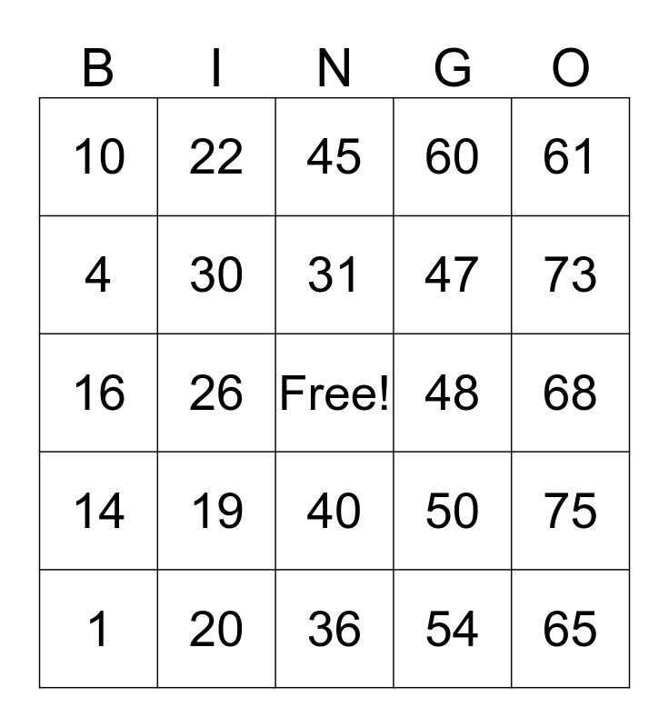 This bingo card has a free space and 24 words: 1, 19, 31, 54, 61, 10, 22, 45, 48, 68, 16, 30, 50, 75, 4, 20, 36, 60, 73, 14, 26, 40, 47 and 65.