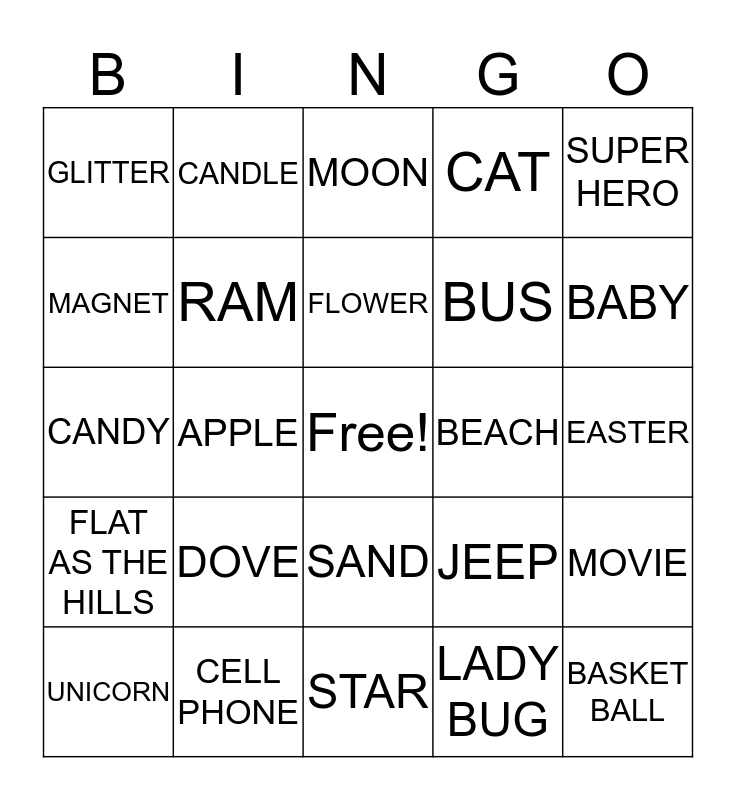 This bingo card has a free space and 24 words: DOVE, CELL PHONE, FLOWER, UNICORN, SUPER HERO, GLITTER, MAGNET, CANDLE, BEACH, SAND, BUS, CANDY, JEEP, MOVIE, RAM, LADY BUG, EASTER, MOON, BABY, APPLE, BASKET BALL, FLAT AS THE HILLS, CAT and STAR.