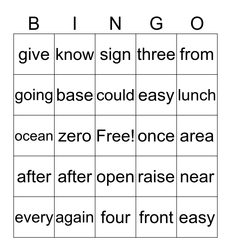 This bingo card has a free space and 24 words: after, again, could, every, from, give, going, know, once, open, easy, ocean, raise, near, base, front, area, sign, lunch, zero, easy, after, three and four.