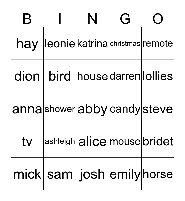 This bingo card has 36 words: Free!, dog, cat, bird, mouse, tv, house, microwave, remote, bed, shower, christmas, santa, candy, lollies, hay, horse, ashleigh, abby, katrina, steve, bridet, sam, mick, josh, leonie, anna, Xav, darren, dion, ben, laura, emily, alice, megs and eliza.