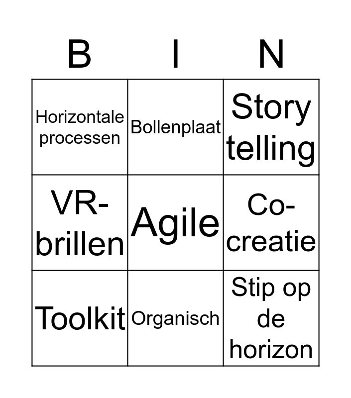 This bingo card has 9 words: Toolkit, Story telling, Bollenplaat, VR-brillen, Horizontale processen, Co-creatie, Agile, Stip op de horizon and Organisch.