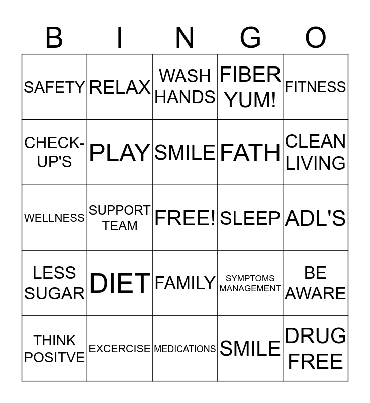 This bingo card has a free space and 24 words: DIET, EXCERCISE, SMILE, THINK POSITVE, FITNESS, SAFETY, CHECK-UP'S, RELAX, SLEEP, FAMILY, FATH, WELLNESS, SYMPTOMS MANAGEMENT, BE AWARE, PLAY, SMILE, ADL'S, WASH HANDS, CLEAN LIVING, SUPPORT TEAM, DRUG FREE, LESS SUGAR, FIBER YUM! and MEDICATIONS.