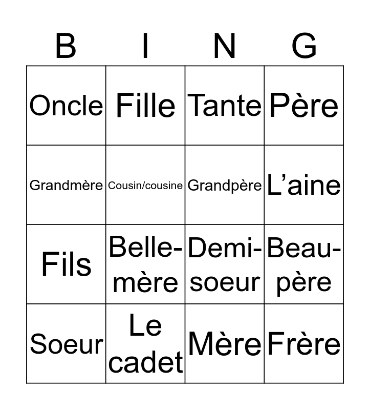 This bingo card has 16 words: Soeur, Le cadet, Tante, Père, Grandmère, Fille, Demi-soeur, Beau-père, Oncle, Cousin/cousine, Mère, L’aine, Fils, Belle-mère, Grandpère and Frère.