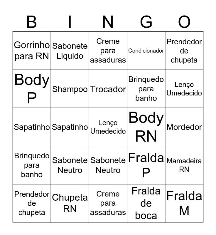 This bingo card has 50 words: Fralda M, Lenço Umedecido, Fralda G, Creme para assaduras, Sabonete Neutro, Hidratante, Sabonete Liquido, Fralda RN, Body P, Chupeta RN, Shampoo, Condicionador, Mamadeira RN, Fralda P, Mordedor, Babador, Trocador, Body RN, Algodão, Prendedor de chupeta, Sapatinho, Fralda de boca, Gorrinho para RN, Brinquedo para banho, Óleo, Fralda M, Lenço Umedecido, Fralda G, Creme para assaduras, Sabonete Neutro, Hidratante, Sabonete Liquido, Fralda RN, Body P, Chupeta RN, Shampoo, Condicionador, Mamadeira RN, Fralda P, Mordedor, Babador, Trocador, Body RN, Algodão, Prendedor de chupeta, Sapatinho, Fralda de boca, Gorrinho para RN, Brinquedo para banho and Óleo.