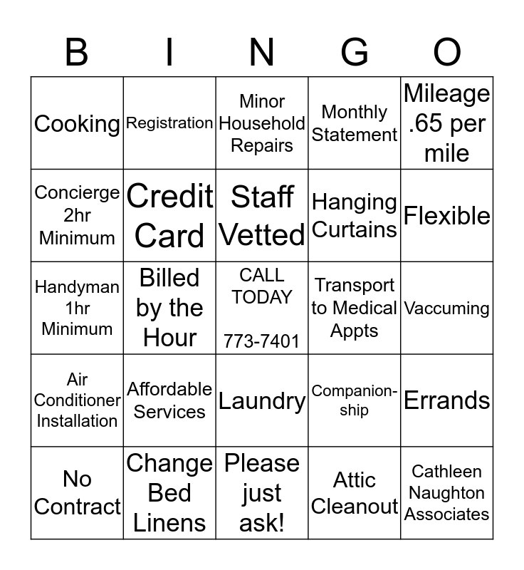 This bingo card has a free space and 24 words: Affordable Services, Change Bed Linens, Staff Vetted, No Contract, Mileage .65 per mile, Cooking, Concierge 2hr Minimum, Registration, Transport to Medical Appts, Laundry, Hanging Curtains, Handyman 1hr Minimum, Companion-ship, Errands, Credit Card, Attic Cleanout, Vaccuming, Minor Household Repairs, Flexible, Billed by the Hour, Cathleen Naughton Associates, Air Conditioner Installation, Monthly Statement and Please just ask!.
