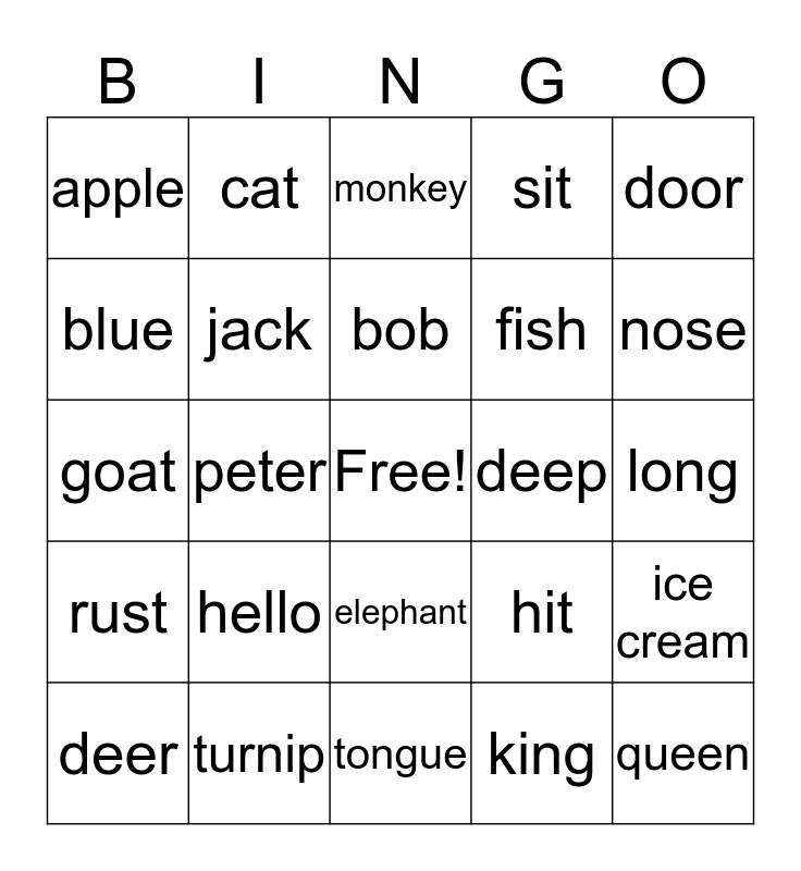 This bingo card has a free space and 24 words: hello, turnip, bob, deer, door, apple, blue, cat, deep, elephant, fish, goat, hit, ice cream, jack, king, long, monkey, nose, peter, queen, rust, sit and tongue.